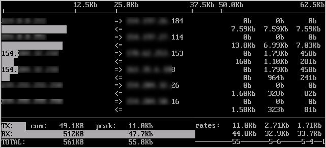 3. 執(zhí)行如下命令,查看導(dǎo)致流量較高的端口與消耗流量的 IP,以 eth0 端口為例。