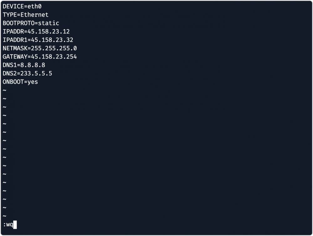 然后輸入":wq",回車,即可保存網關配置文件