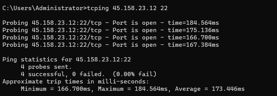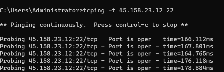 tcping的使用非常簡單,例如,我們要檢測IP 45.158.23.12的22端口是否可以連通,可以執行 tcping ip地址 端口