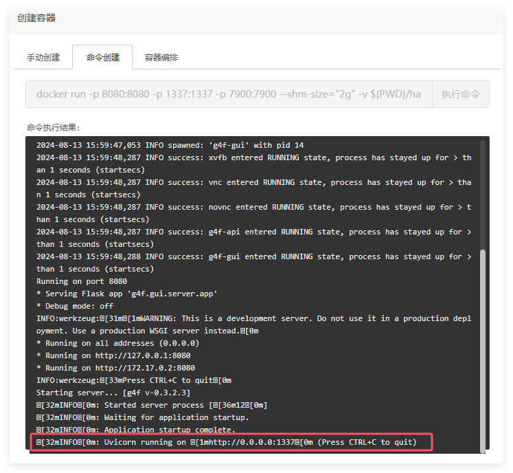 拉取完成鏡像后,點擊容器,創建容器,選擇命令創建,復制下面的命令到文本框中,然后點擊執行命令。